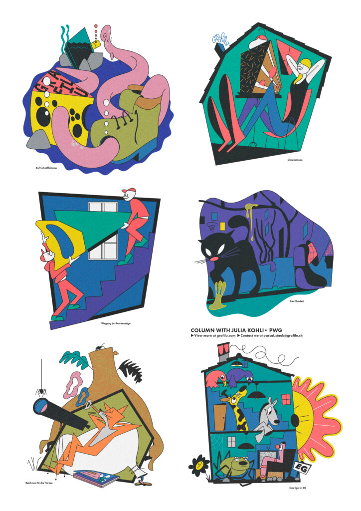 Playful lines and colourful forms illustrate, with a humorous touch, scenes inspired by the texts of Swiss author Julia Kohli.